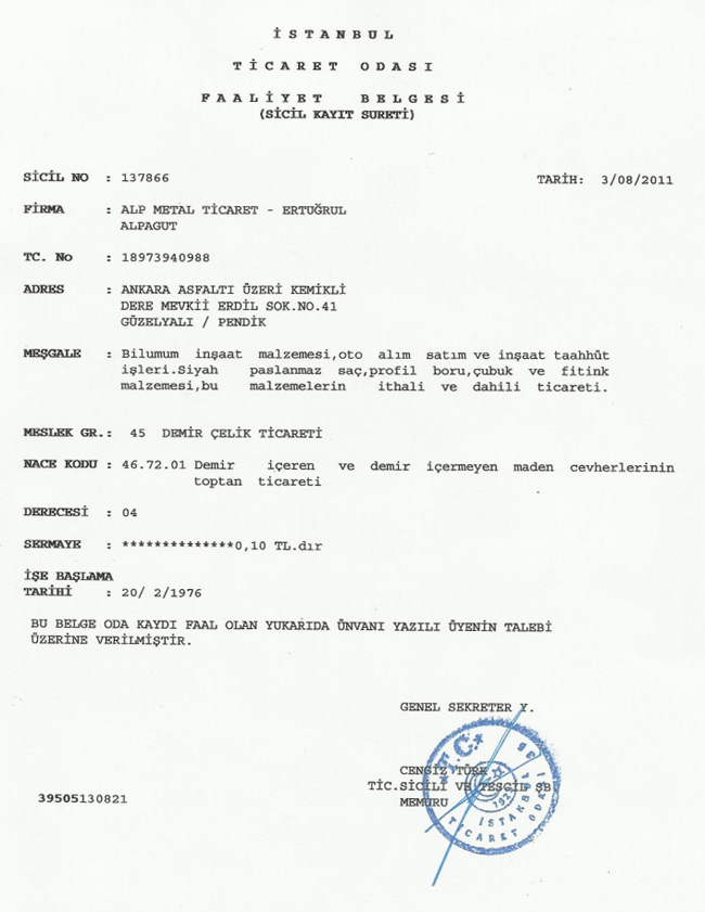 Alp Metal Ticaret, İstanbul Pendik bölgesinde faaliyet göstermekte olup, Alp Metal Paslanmaz Çelik Tic. Ve San. A.Ş ise İstanbul Zeytinburnu Demirciler Sitesi'nde faaliyetlerini sürdürmektedir.